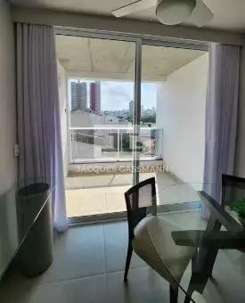 2 dormitórios sendo 1 suíte com cama queen, sala ampla 2 ambientes com sacada, Sala TV e jantar, Cozinha com armários planejados, 1 banheiro social com box de vidro, área de serviço com armários, 2 vagas de garagem.