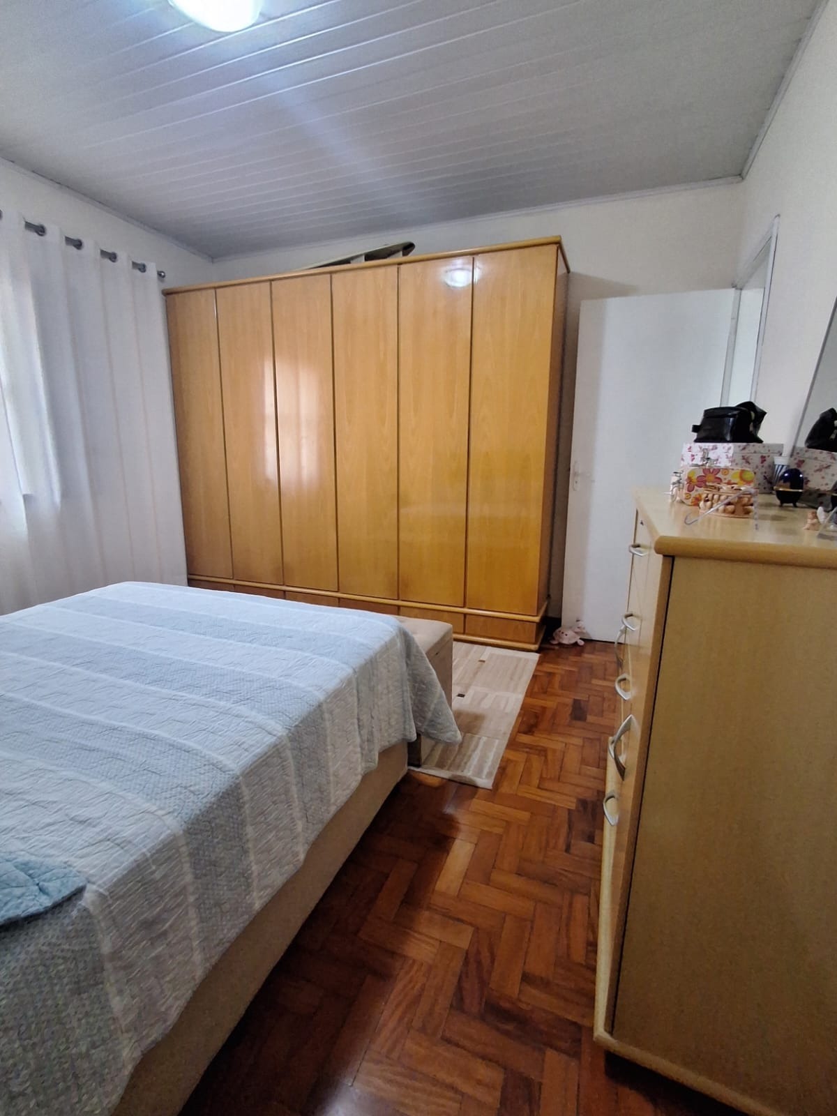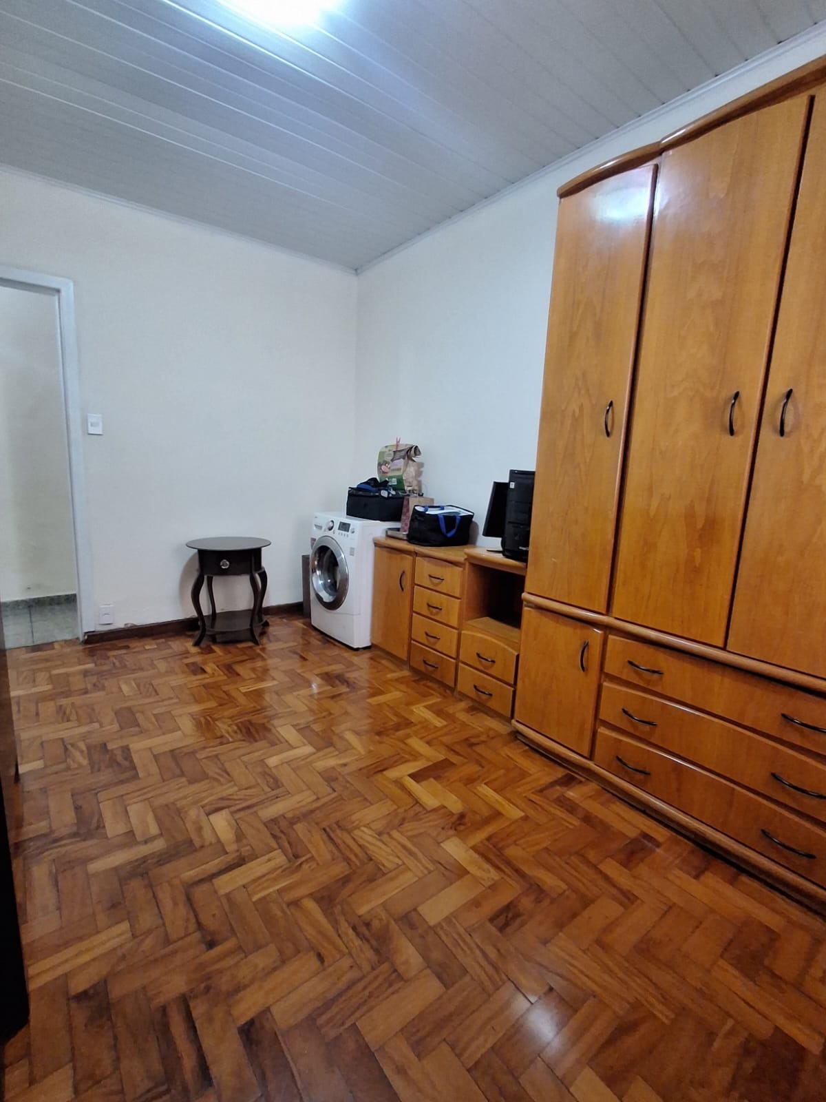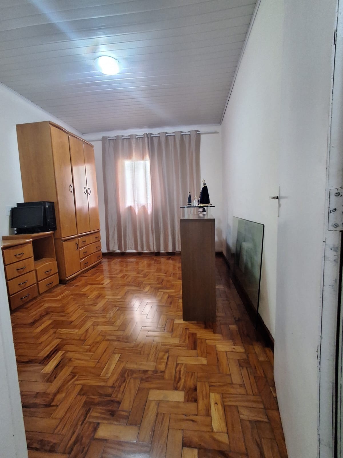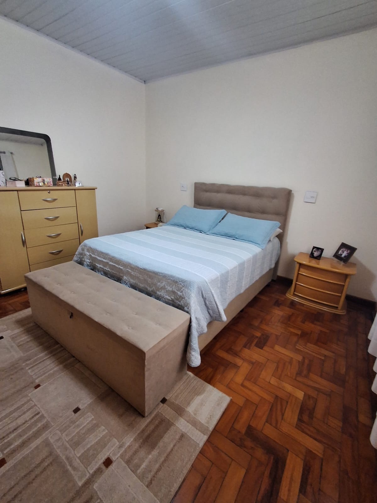 A casa conta com uma sala espaçosa com piso cerâmico, ideal para compor diferentes ambientes. São 3 dormitórios com piso em taco de madeira bem conservado, trazendo charme e aconchego.