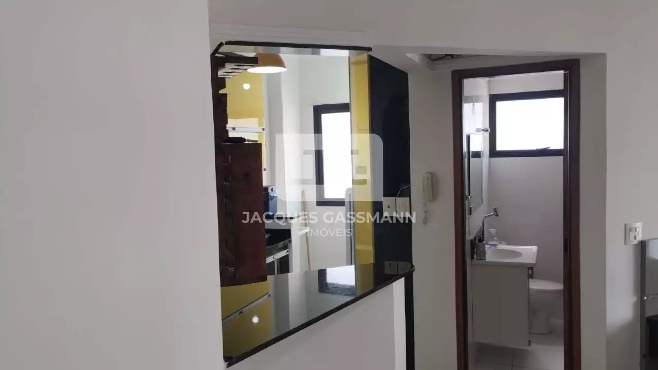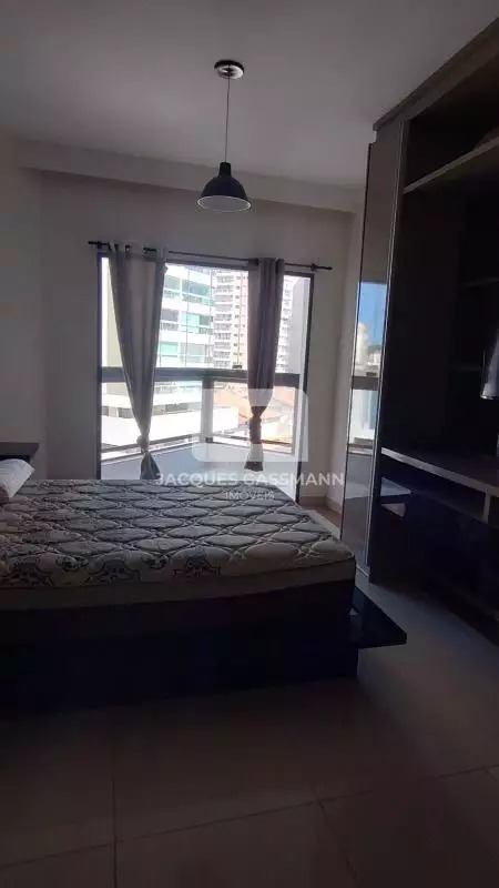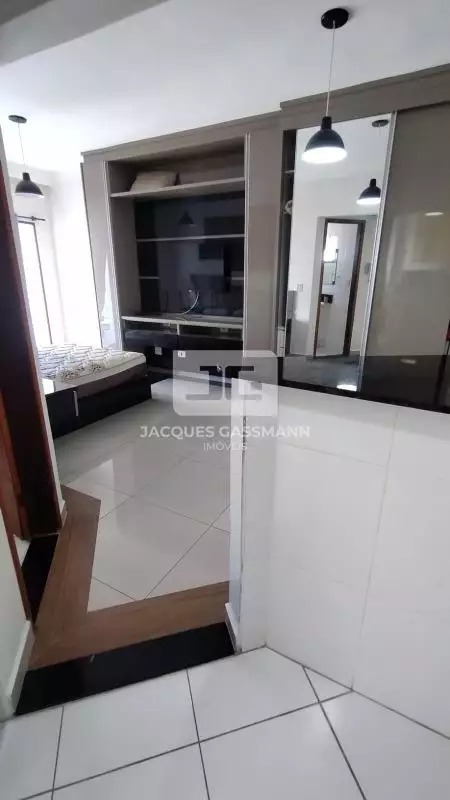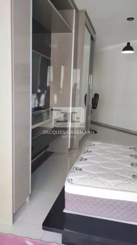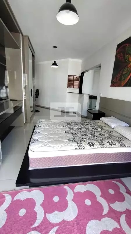 A cozinha conta com móveis planejados em excelente estado, equipada com cooktop a gás canalizado e geladeira, além de área de serviço integrada com máquina lava e seca. O ambiente principal dispõe de guarda-roupa amplo com espelho e cama de casal, além de uma charmosa sacada envidraçada, que amplia o espaço e oferece mais conforto.