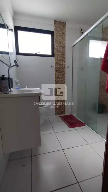 O banheiro é completo, com armários, box de vidro e ventilação natural.