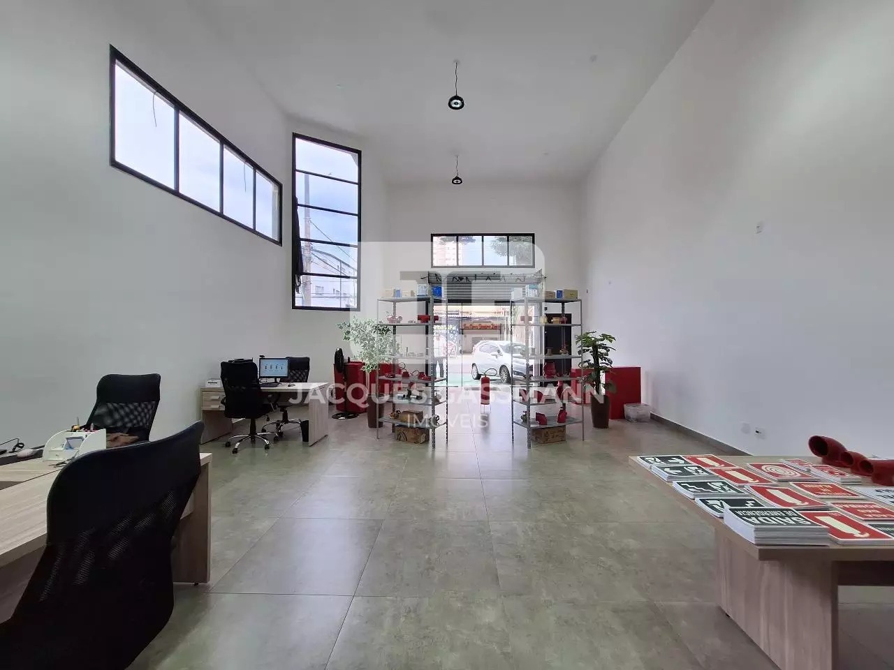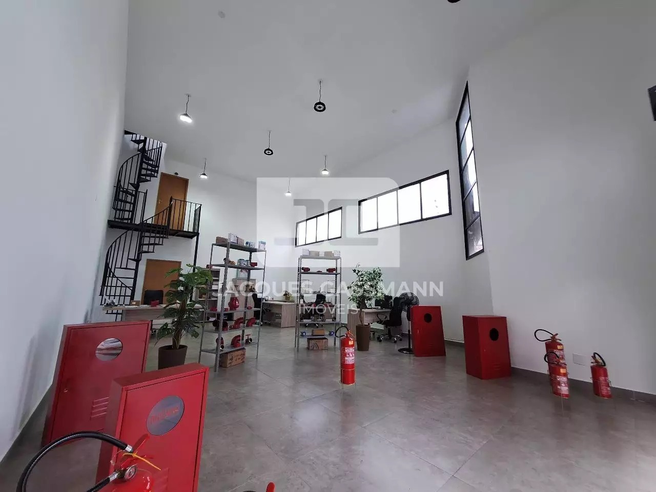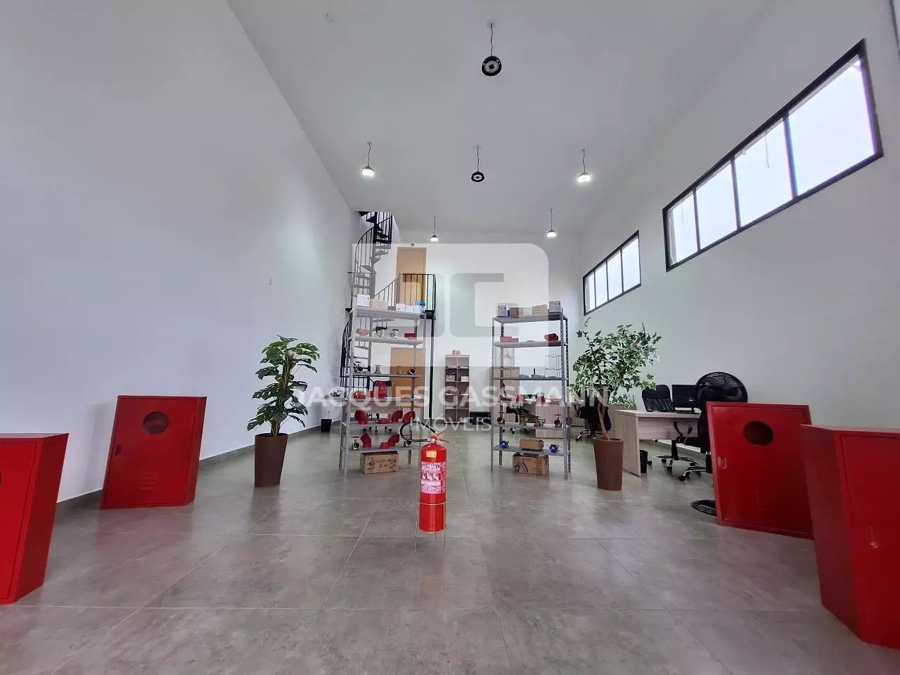 o acesso limitado e restrito, além de uma porta de entrada lateral. Possui pé direito de 6 metros de altura, podendo ser feito um mezanino. Possui