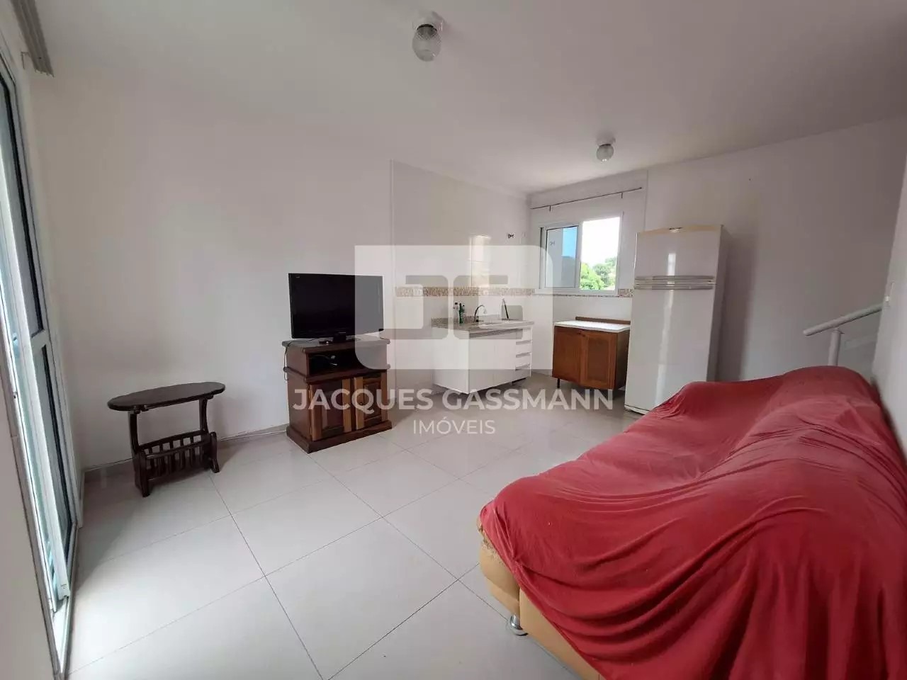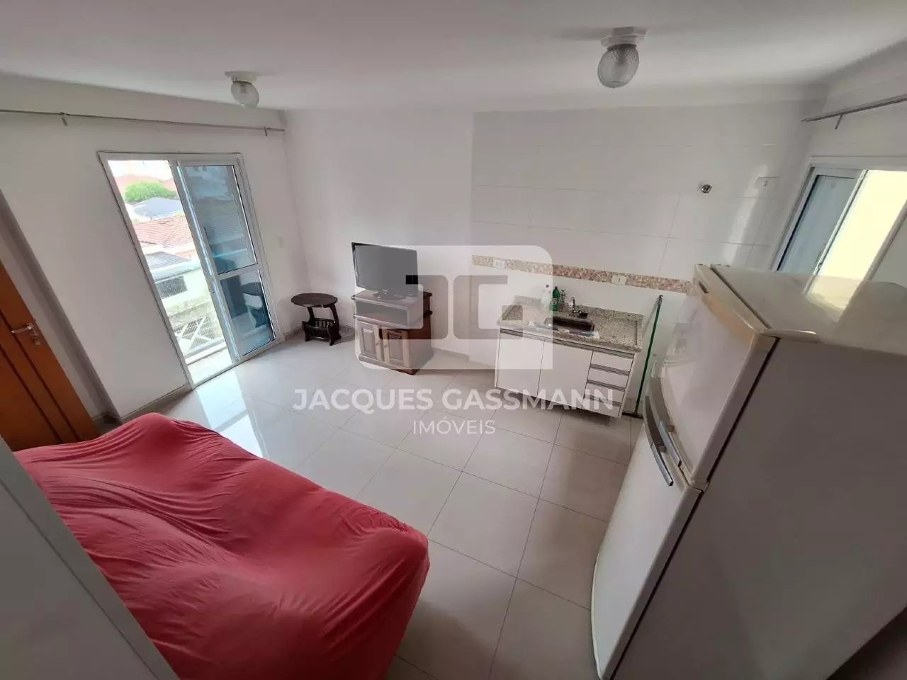 - Sala de estar integrada à cozinha já com gabinete e geladeira, além de sacada com vista livre.