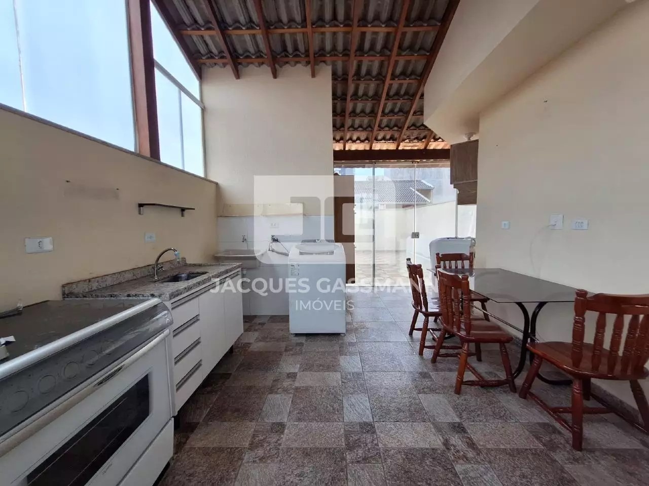 Pavimento superior conta com área gourmet que pode ser instalada uma churrasqueira, metade coberta e metade descoberta, além de um lavabo para atender o pavimento superior.