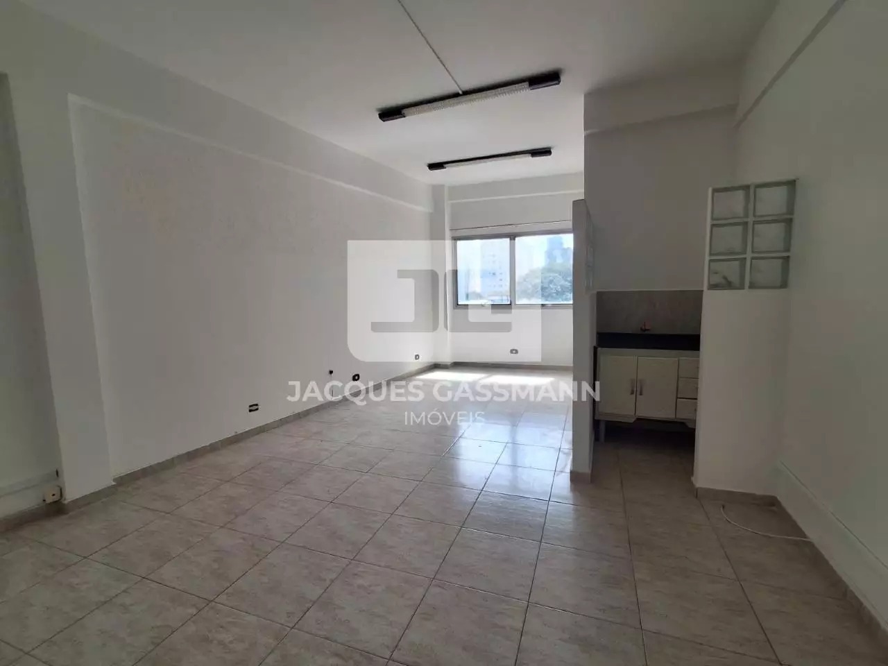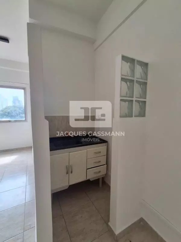 A sala possue duas janelas grandes em cada lado da sala. Possue uma copa com pia de cozinha e armário.