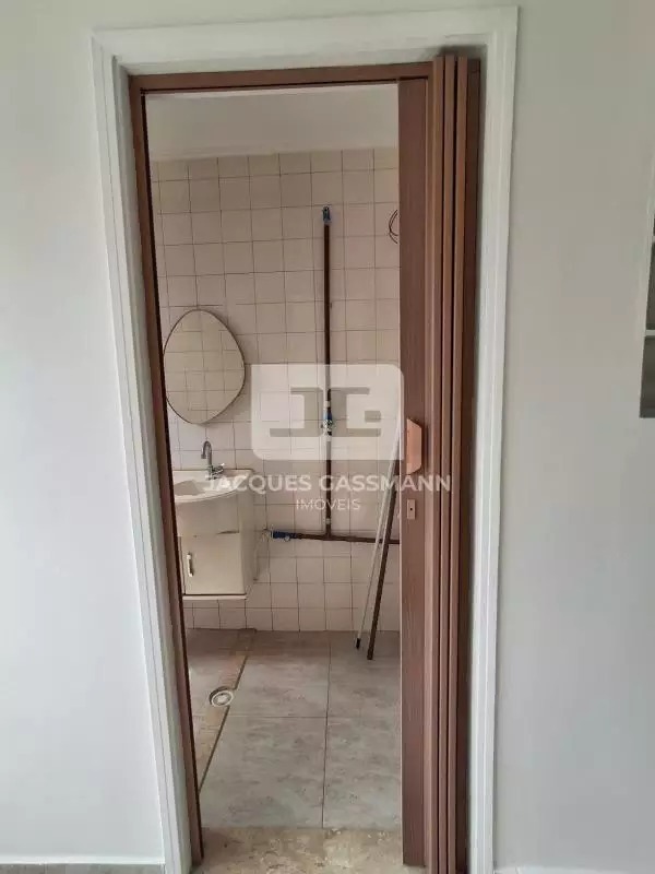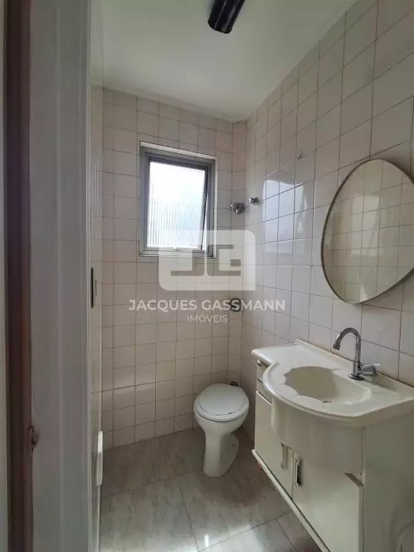 Banheiro com pia, armário, espelho, ventilação natural e possibilidade de instalação para chuveiro.